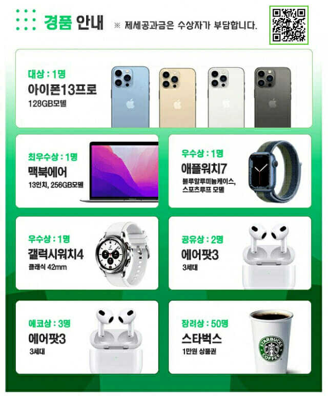 창의적이고 진정성 있는, 감동적인 작품들을 선별해 아이폰13프로, 맥북에어, 애플워치7, 갤럭시워치4, 에어팟3, 스타벅스 모바일 쿠폰 등을 증정한다. 아울러 이벤트 소식 또는 자신의 글을 페이스북, 블로그, 카카오톡 등 소셜네트워크서비스에 공유하는 참여자 중 2명을 뽑아 에어팟3를 선물한다.