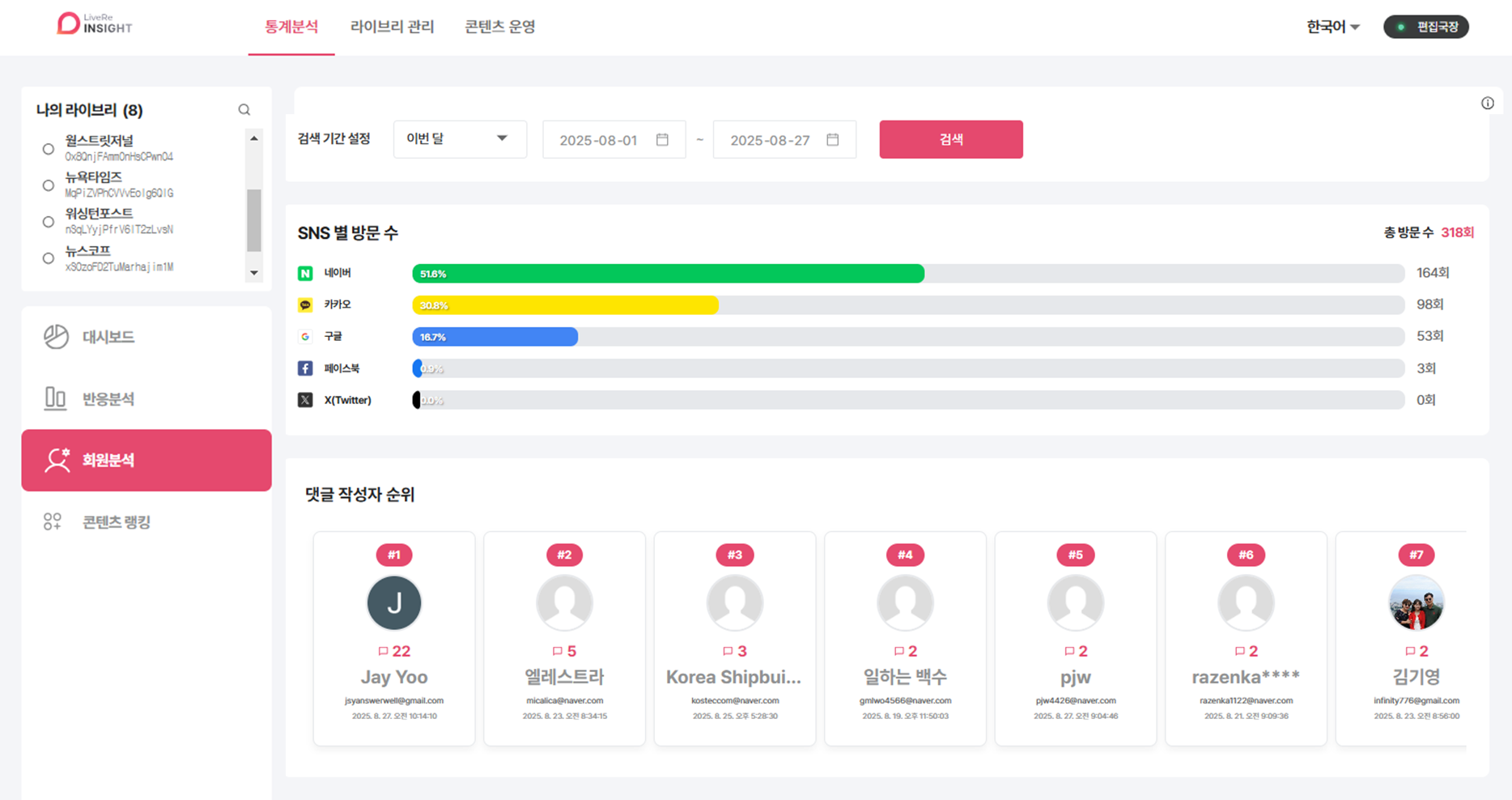 매일 수많은 기사와 독자 반응 속에서 더 나은 저널리즘과 소통을 위해 고민하시는 언론사 및 편집국 관계자 여러분께 반가운 소식을 전합니다. 독자 데이터를 더욱 빠르고 깊이 있게 분석하여, 기사 기획과 커뮤니티 관리에 곧바로 활용할 수 있도록 '라이브리 인사이트'의 통계 기능을 대규모로 업그레이드했습니다.