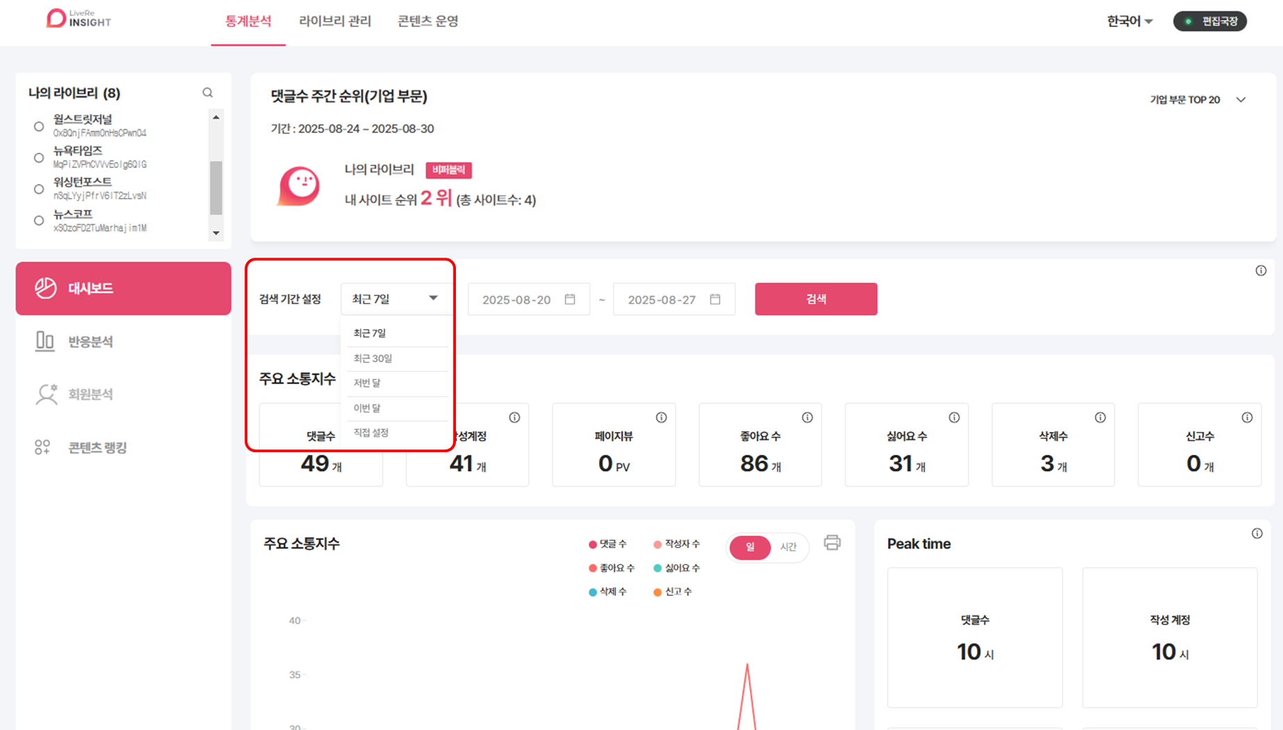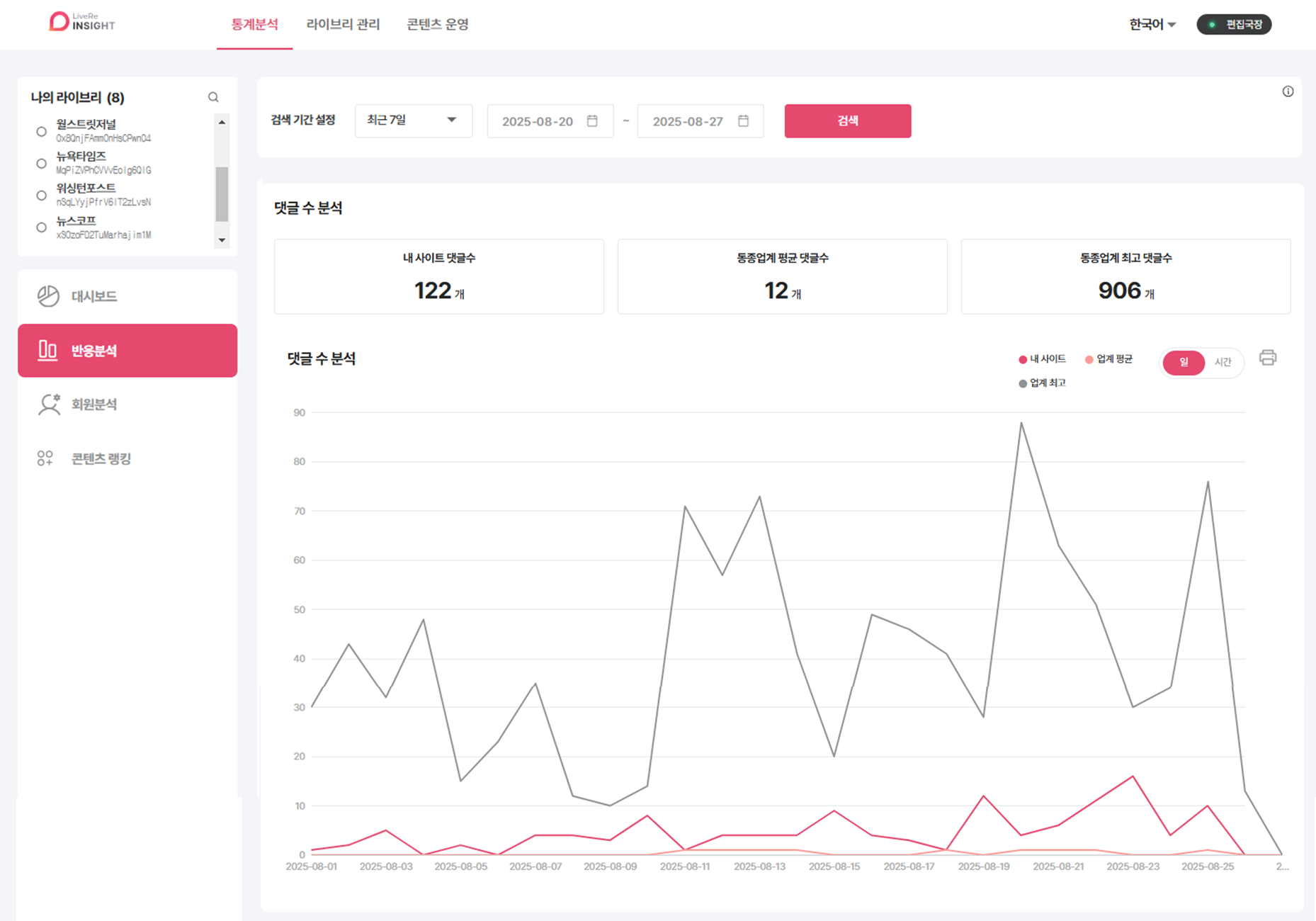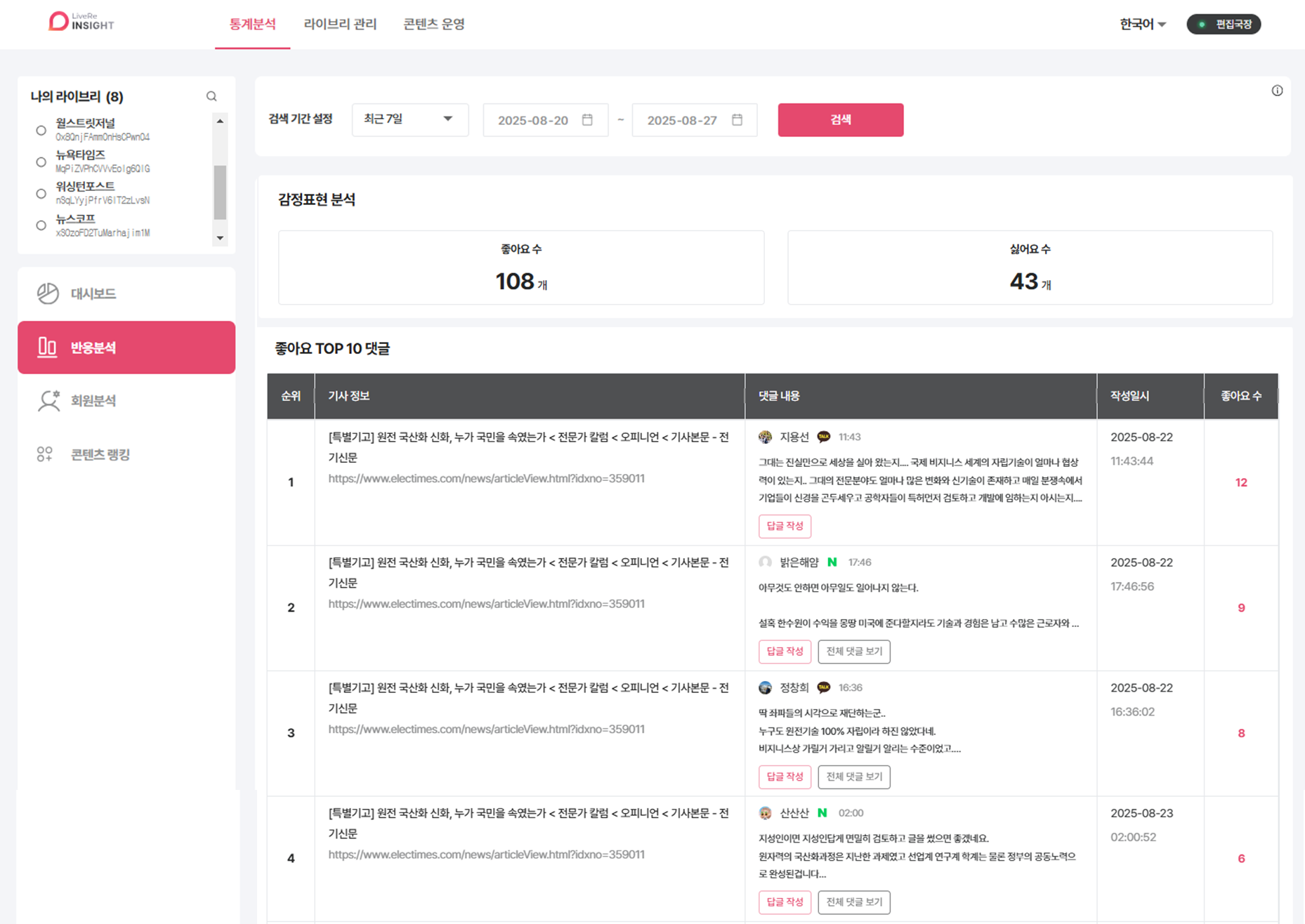 매일 수많은 기사와 독자 반응 속에서 더 나은 저널리즘과 소통을 위해 고민하시는 언론사 및 편집국 관계자 여러분께 반가운 소식을 전합니다. 독자 데이터를 더욱 빠르고 깊이 있게 분석하여, 기사 기획과 커뮤니티 관리에 곧바로 활용할 수 있도록 '라이브리 인사이트'의 통계 기능을 대규모로 업그레이드했습니다.