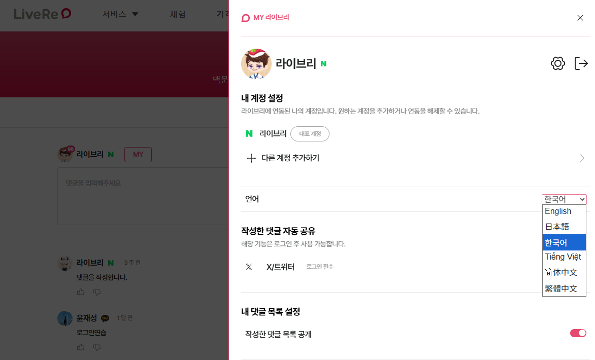 - 라이브리 위젯 로그인 후, 위젯 상단의 [MY] 버튼을 클릭하여 원하는 언어로 변경할 수 있습니다.