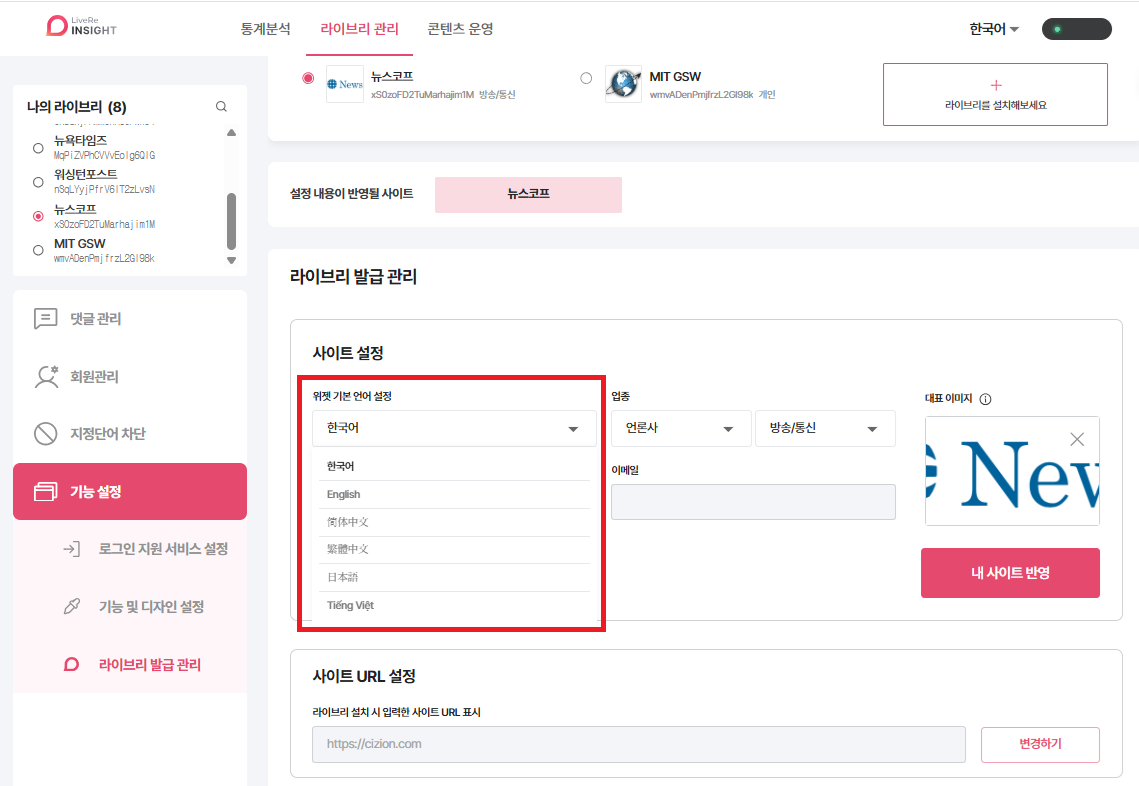 - 위젯 기본 언어 설정: ① 좌측 메뉴 [라이브리 관리] > [기능 설정] > [라이브리 발급관리] 이동 ② [사이트 설정] 영역의 '위젯 기본 언어 설정'에서 선택